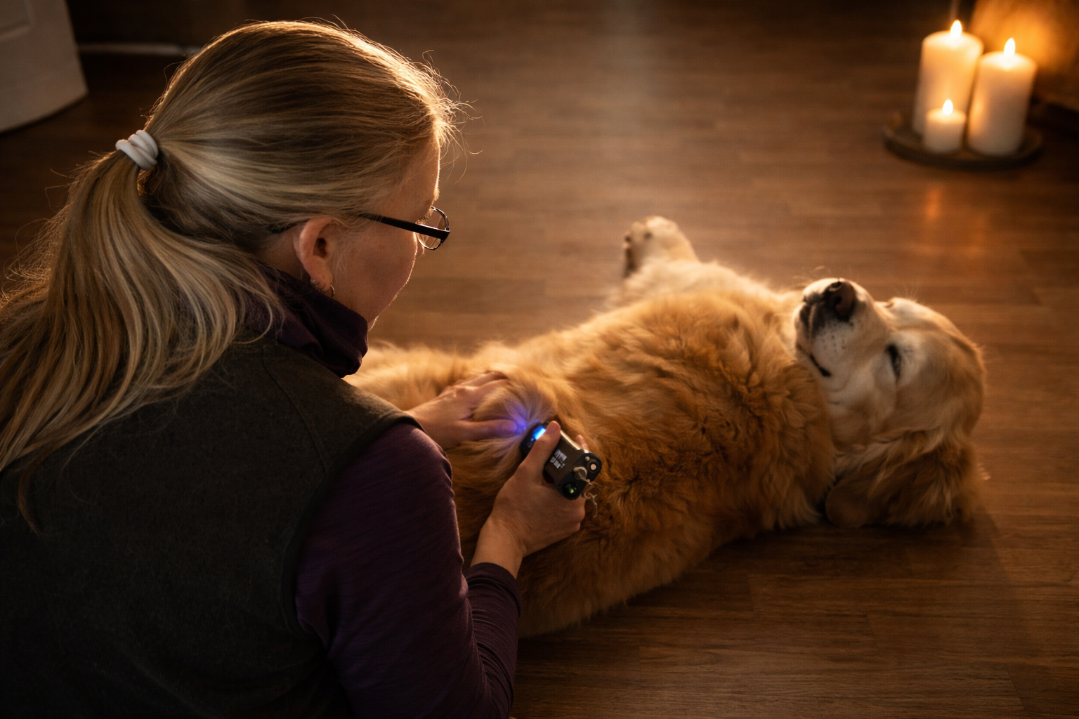 Det är svårt att behandla en blöt och/eller smutsig hund, då smuts absorberar laserljuset, väta leder ström (fel väg) samt skapar friktion vid massage. Använd gärna regntäcke vid nederbörd på din väg hit och undvik leriga gångvägar om möjligt.
